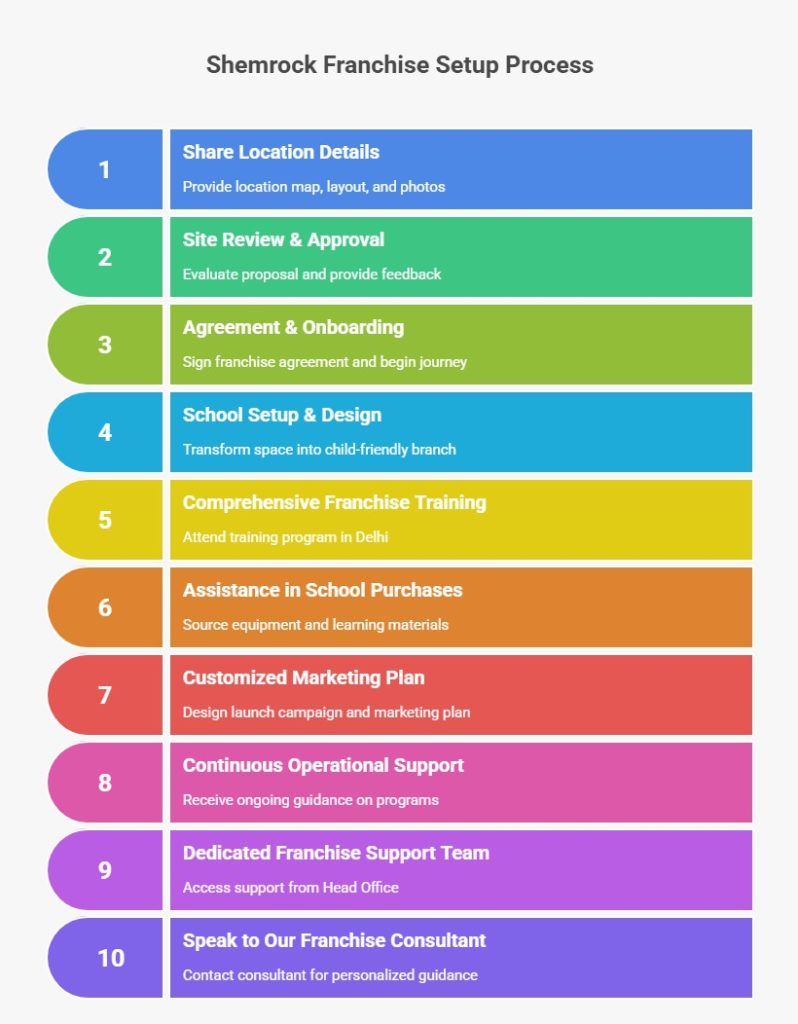 Starting your own Shemrock Playschool is a simple and rewarding journey. We have designed a seamless 10-step process to help aspiring entrepreneurs set up a successful preschool with complete guidance and support from our expert team.