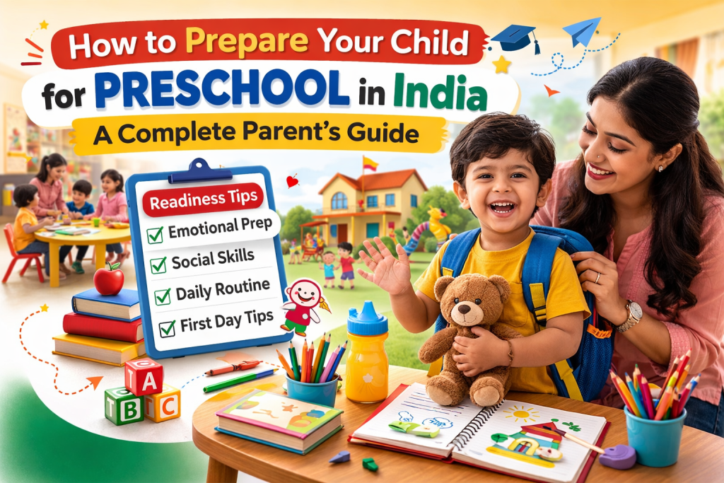 Sending your child to preschool for the first time is not just an admission milestone — it’s an emotional turning point for the entire family. For many Indian parents, this phase comes with mixed feelings: Will my child cry every day? What if they refuse to stay in class? Are they too small? Have I prepared them enough? If you’re feeling anxious, you’re not alone. Every year, thousands of first-time parents search for how to prepare child for preschool in India, and most of them share the same concerns. The good news? With the right preparation, preschool becomes a joyful beginning — not a stressful one. This complete parent’s guide will walk you through everything you need to know — emotionally, socially, and practically — to make your child’s preschool journey smooth and confident. When Is the Right Age for Preschool in India? In India, preschool admissions generally follow this age structure: Playgroup: 2–3 years Nursery: 3–4 years LKG (Lower Kindergarten): 4–5 years However, preschool readiness is not just about age. It’s about developmental readiness. Signs Your Child Is Ready for Preschool Your child may be ready if they: Show curiosity about other children Can sit for 5–10 minutes for a simple activity Follow basic instructions (“Give me the ball”) Express basic needs verbally or through gestures Manage short separations from parents If your child is still clingy or shy, don’t panic. These are common and manageable through gradual preparation. Emotional Preparation: Reducing Separation Anxiety One of the biggest concerns parents have about the first day of preschool is separation anxiety. Let’s understand this clearly:Crying in the first few days is normal. It does not mean your child is not ready. How to Reduce Separation Anxiety Before Preschool 1. Practice Short Separations Start small: Leave your child with grandparents for an hour. Encourage playdates where you step away briefly. Attend hobby classes where they sit independently. Gradual exposure builds confidence. 2. Talk Positively About School Use excitement, not fear. Instead of saying: “If you don’t listen, I’ll send you to school!” Say: “You’ll make new friends and play with toys at school!” Children absorb your tone more than your words. 3. Create a Goodbye Ritual A simple routine works wonders: One hug One high-five One cheerful “See you soon!” Consistency makes transitions predictable and comforting. 4. Manage Your Own Emotions Children sense parental anxiety instantly. If you look worried at drop-off, your child will feel unsafe.Stay calm, confident, and cheerful — even if you’re emotional inside. Social Preparation: Helping Your Child Interact Confidently Preschool is often a child’s first structured social environment. Here are essential preschool readiness tips: Teach Sharing and Turn-Taking At home: Play simple board games. Practice taking turns while playing with blocks. Say: “Now it’s mamma’s turn, then it’s your turn.” Encourage Interaction with Other Children Arrange playdates. Visit parks regularly. Encourage group activities. Even observing other children helps shy kids adjust. Teach Basic Manners Simple habits matter: Saying “please” and “thank you” Greeting teachers Asking before taking toys Following Simple Instructions Practice 2-step commands: “Pick up your shoes and keep them in the rack.” “Bring your bottle and sit here.” This helps during classroom routines. Building Independence Skills: Preschool Preparation Checklist Preschool is smoother when children can manage basic tasks independently. Preschool Preparation Checklist Eating Skills Eats with a spoon independently Drinks from a cup or bottle without spilling Sits in one place while eating Toilet Readiness Can communicate toilet needs Wears easy-to-remove clothing Basic toilet training initiated Hygiene Habits Washes hands with guidance Uses a handkerchief Covers mouth while sneezing Dressing Skills Wears shoes (with assistance if needed) Recognizes their own bag and bottle Responsibility Basics Helps pack their bag Identifies personal belongings Remember: perfection is not required. Basic familiarity is enough. Establishing a Preschool Routine Routine reduces anxiety. Start preparing at least 2–3 weeks before school begins. 1. Align Sleep Schedule 10–11 hours of night sleep Fixed bedtime Wake up at school time daily Late-night screen habits must reduce gradually. 2. Practice a Morning Routine Simulate school mornings: Wake up Brush Get dressed Eat breakfast Leave the house Make it fun and predictable. 3. Reduce Screen Time Excessive screen exposure affects attention span. Replace screens with: Picture books Storytelling Puzzles Building blocks 4. Build Healthy Eating Habits Encourage: Simple home-cooked meals Fruits Finger foods they can manage independently Preparing for the First Day of Preschool Here’s a step-by-step plan to make the first day of preschool smoother. Step 1: Visit the School Beforehand Show the classroom Introduce the teacher Let your child explore the environment If considering admissions, explore the Preschool Admission in India process early. Step 2: Meet the Teacher Build trust: Share your child’s habits Mention allergies or concerns Ask about adjustment support Step 3: Pack Smart Typical essentials: Extra clothes Labeled water bottle Small napkin Comfort object (if allowed) Step 4: Say Goodbye Confidently Keep it short. Do not sneak away. Do not return repeatedly if they cry. What NOT To Do Don’t threaten with school. Don’t compare with other children. Don’t prolong drop-off. Handling the First Week of Preschool The first week may include: Crying at drop-off Clinginess at home Temporary sleep changes This is normal. How Long Does Adjustment Take? Typically: 3–7 days for some children 2–4 weeks for others Every child has a different temperament. How Parents Should Respond Stay calm and consistent. Avoid dramatic reactio